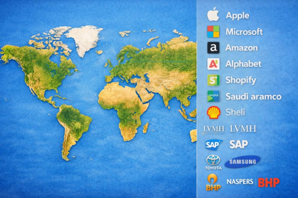 왼쪽에 세계지도가 있고, 오른쪽에 시가총액 상위 기업들의 로고가 가로로 나열되어 있는 일러스트