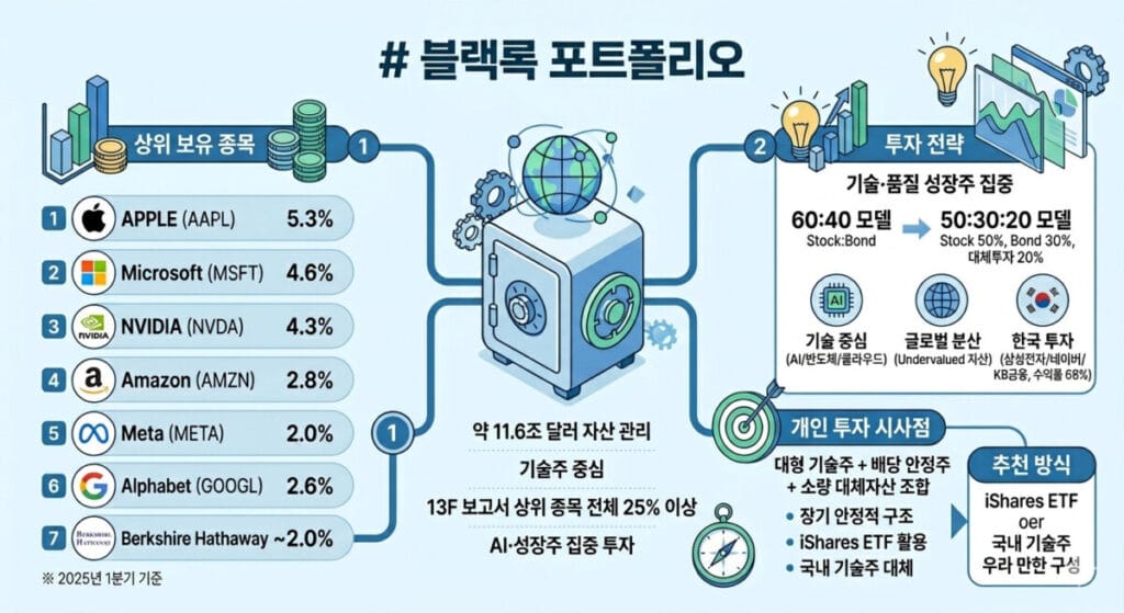 - 블랙록 포트폴리오는 미국 대형 기술주를 중심축으로 두되 품질주와 안정성을 함께 섞는 구조로 이해해야 핵심이 보입니다.