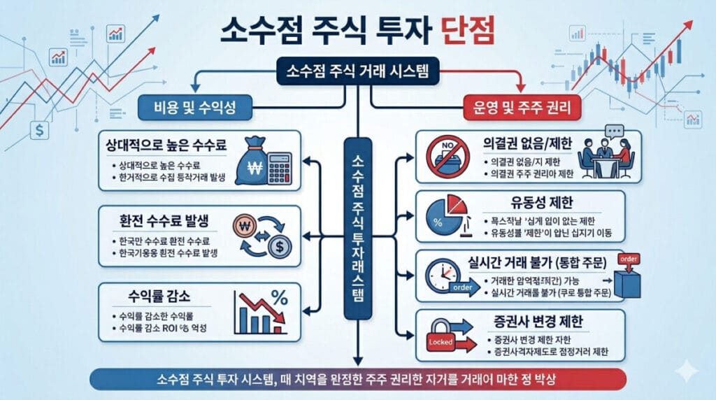정의: “소수점 주식 단점”은 투자자가 1주 미만 단위로 주식을 매수할 수 있는 대신, 주문·체결 방식, 매도 편의성, 주주권 행사, 수수료와 환전 비용 등에서 일반 주식과 다른 불편이나 제한을 겪을 수 있는 요소를 뜻합니다.