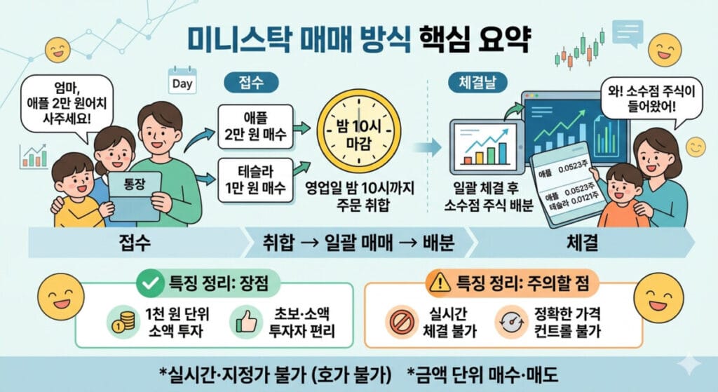 미니스탁은 실시간 지정가 거래를 직접 조절하는 서비스와 사용 감각이 다릅니다. 주문을 넣는 순간 바로 체결가를 확정적으로 통제하는 구조가 아니라, 일정 시간까지 접수된 주문이 모여 처리되는 흐름이기 때문에 투자자는 편리함을 얻는 대신 가격 감각에서 차이를 느낄 수 있습니다.