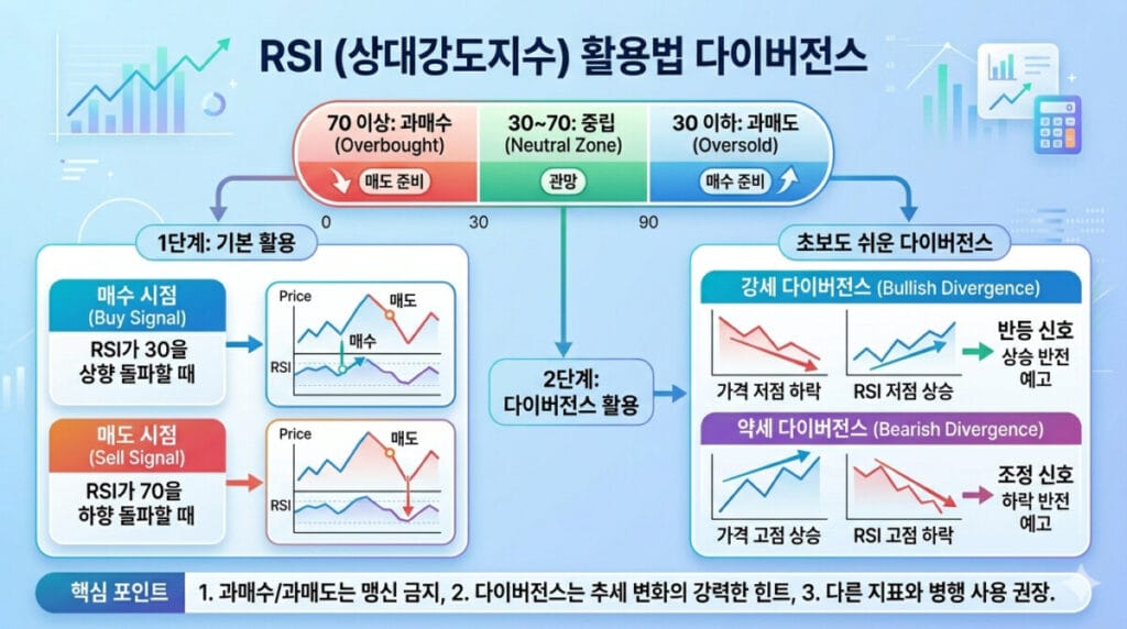 실무적으로는 30과 70만 외우기보다 50선, 최근 방향 변화, 가격의 지지 저항 위치를 함께 묶어 해석하는 방식이 훨씬 안정적입니다. 여기에 다이버전스와 거래량까지 보완하면 RSI 지표의 오신호를 줄이고 판단의 질을 높일 수 있습니다.
